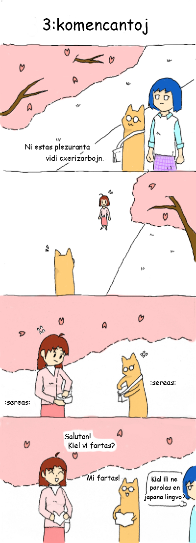 マンガとは日本のコミックスです。 私は日本に住んでおり、毎日多くのマンガを読んでいます。マンガが大好きです。そんなわけで、エスペラントでマンガを描くのを始めました。多分イイ訓練だ :-)